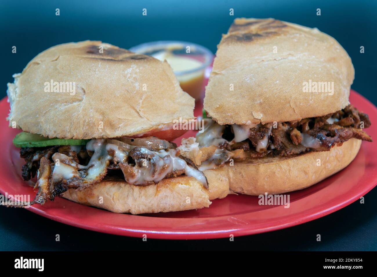 Pork Al Pastor Torta Sandwich Loaded With Meat And Cheese Cut In Half And Presented On A Red Plate Stock Photo Alamy